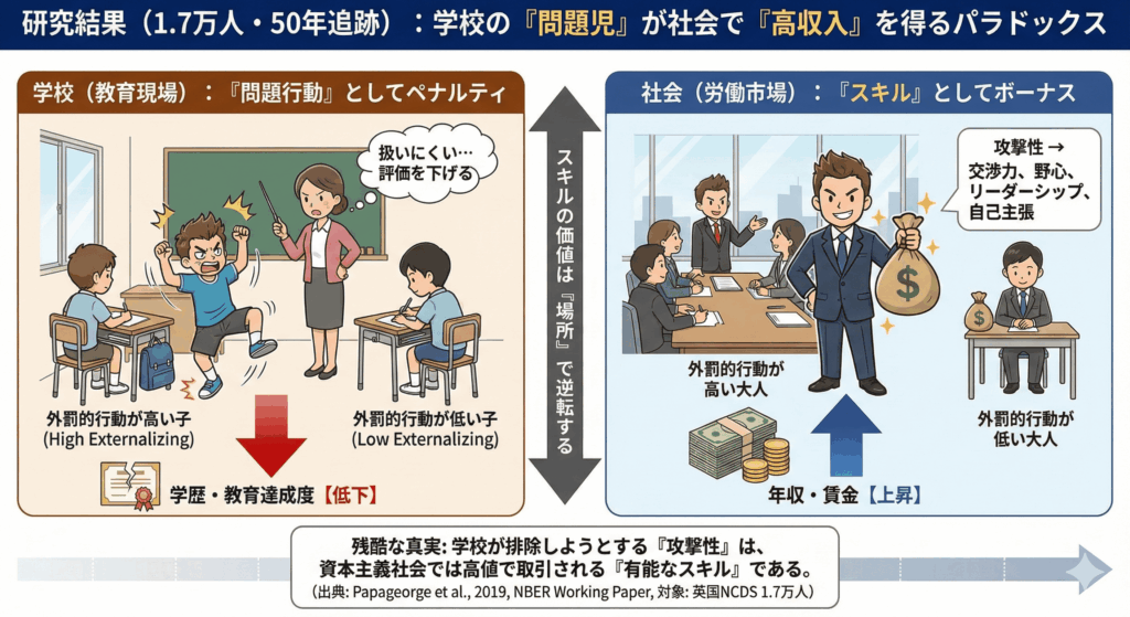 - 市場からのボーナス: しかし、労働市場に出ると一転、彼らの「攻撃性」や「自己主張の強さ」は賃金プレミアム(昇給)として評価される。この傾向は男女問わず、あらゆる職種で見られた。