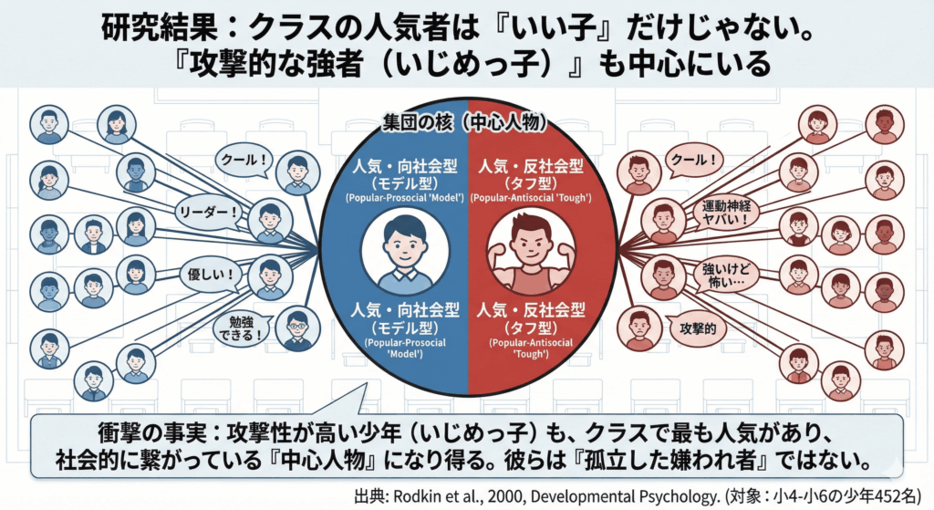 - 「タフ型」という人気いじめっ子の存在: クラスの人気者には、単に「いい子(モデル型)」だけでなく、「攻撃的で反社会的な少年(タフ型)」という確固たるカテゴリーが存在していた。