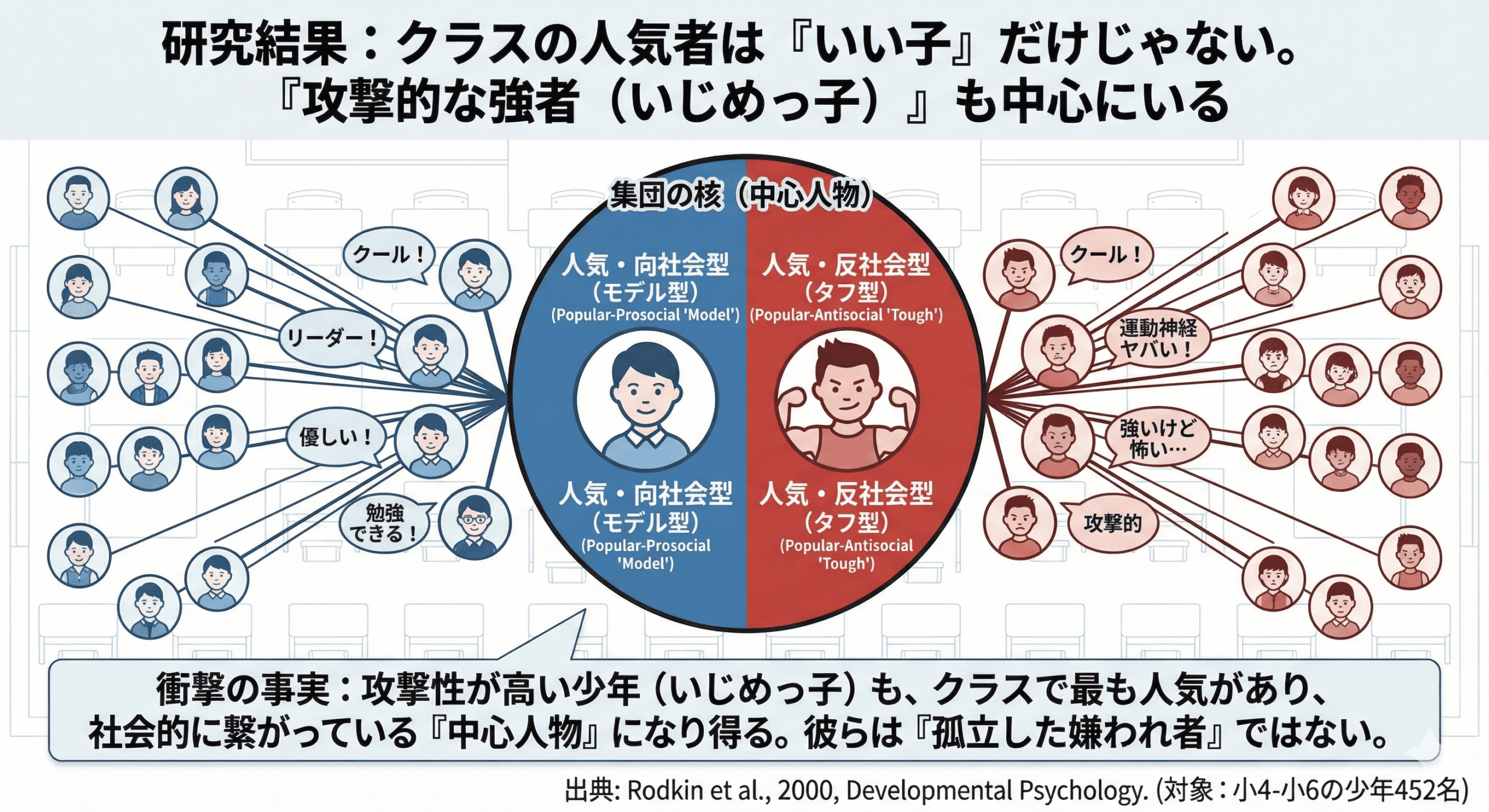 - 社会的な位置付け: 「モデル型」も「タフ型」も、どちらも集団のネットワークにおいて「核(中心人物)」に位置していた。いじめっ子は、決して孤立した嫌われ者ではなく、集団の真ん中に座る支配者だった。