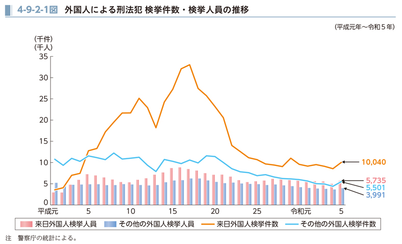 令和6年度版犯罪白書からデータを紹介します。外国人による犯罪のピークは2005年ごろであることがわかりました。
