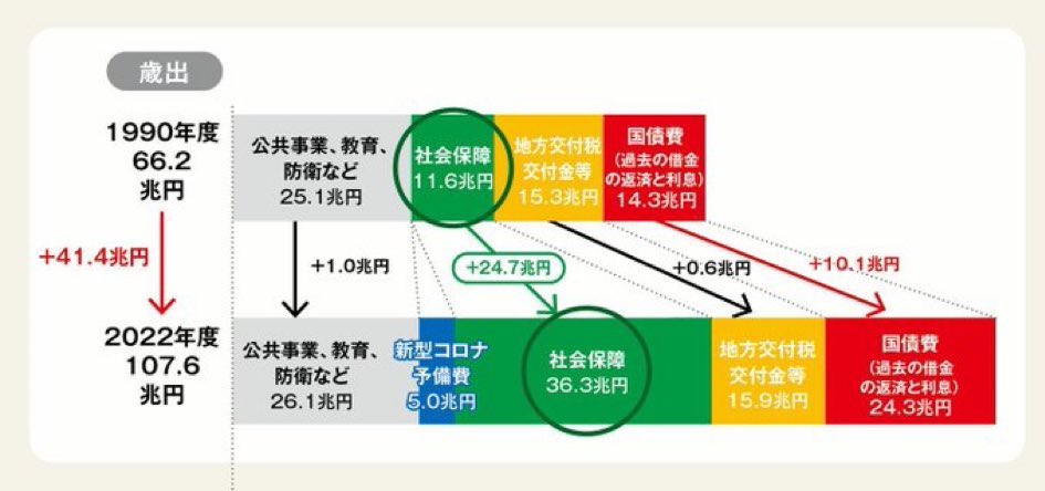 の2つが占めている一方、防衛や教育・公共事業に対して投下する予算はほとんど増加していない状況でした。