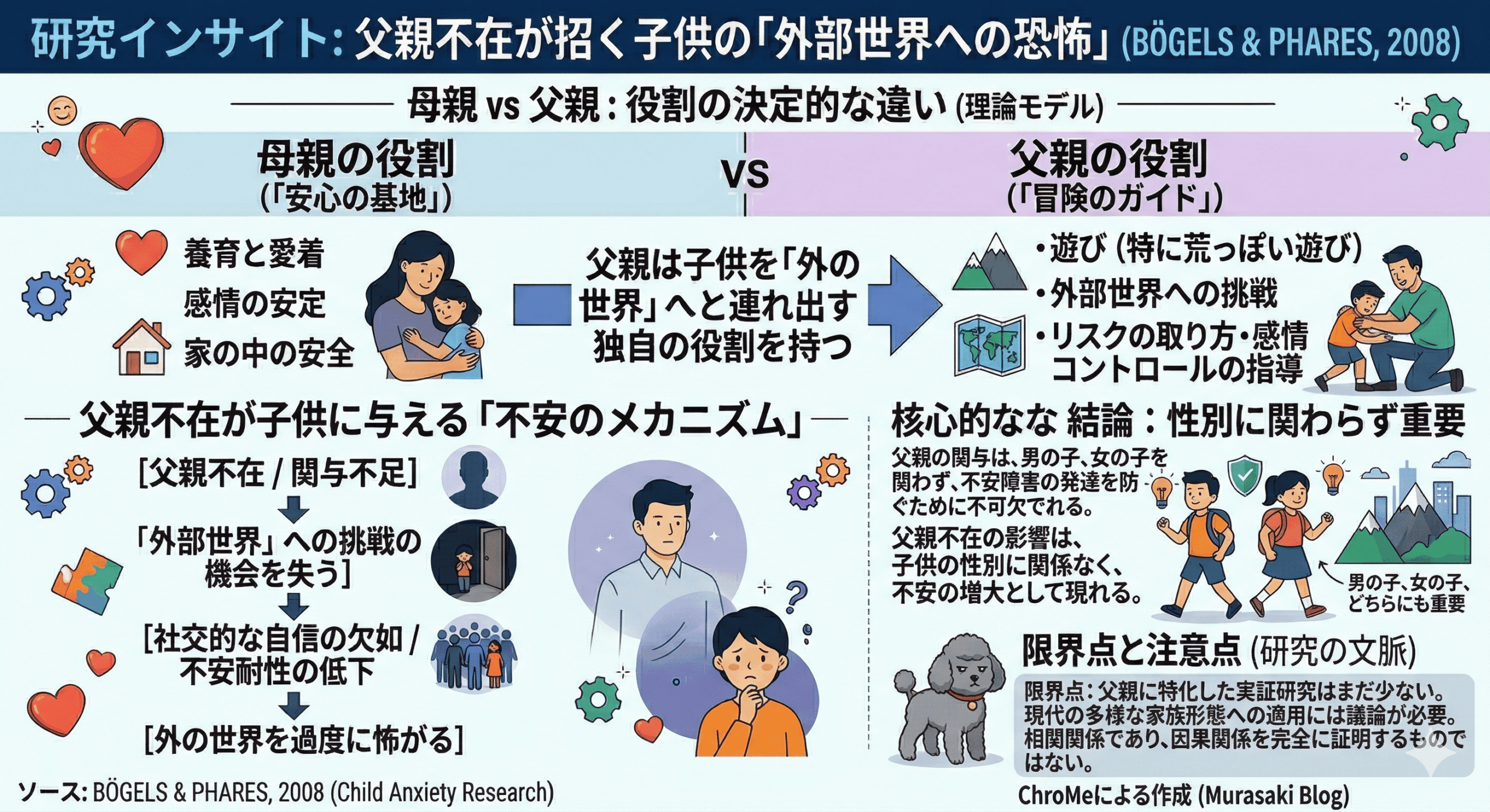 父親の遊びは、子どもの活動的、競争的、自律的、好奇心旺盛な態度を促進し、子どもの認知的・社会的発達に有益な効果をもたらし、早期の分離不安、見知らぬ人への不安、新奇性への不安を緩衝するようです。
