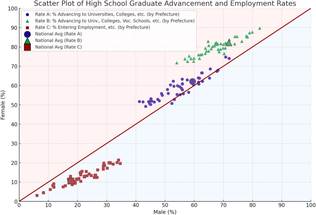 - 就職と進路の傾向: 女性が進学を志向する一方、男性は高校卒業後に直接就職する割合(Rate C)が高い傾向にある。