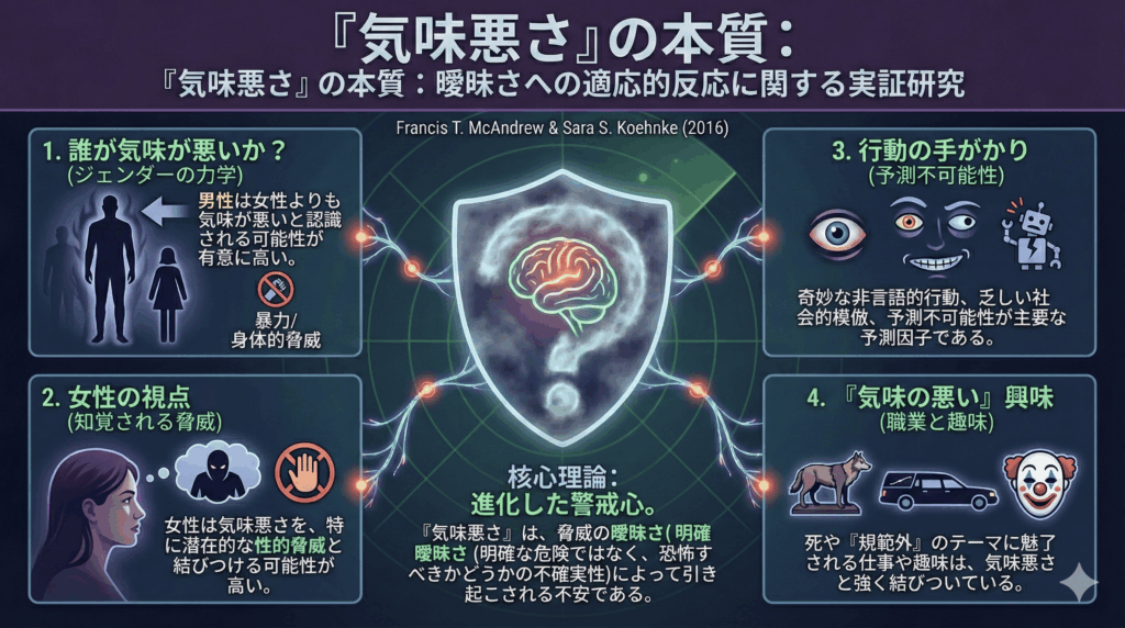 この結果は「不気味だと感じる(creeped out)」という反応は、脅威の存在が「曖昧」な状況に対する、進化した適応的な感情反応であるという仮説を支持しています。