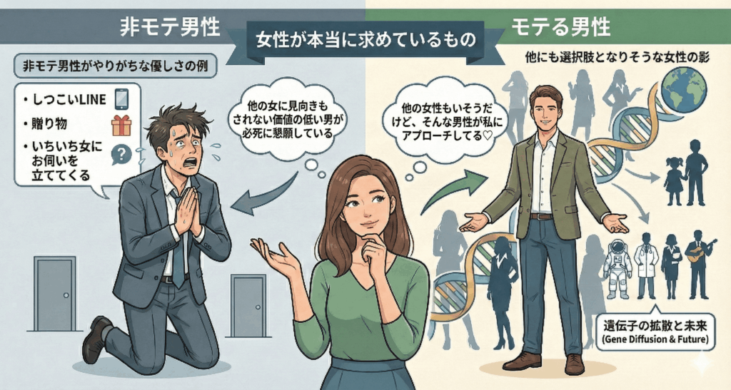 自分の遺伝子を託す相手として、「誰にも相手にされないから媚びている男」を選ぶことは、進化の歴史において致命的なエラーとなります。