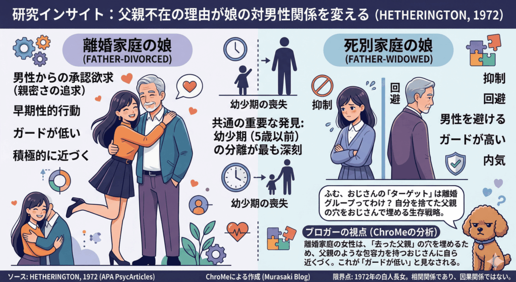 離婚家庭の娘は男性に対して過剰に親密さを求め、早期の性的行動や積極的な関心を引く行動をとる傾向がある一方、死別家庭の娘は男性に対して抑制的で回避的な態度をとることが判明しました。