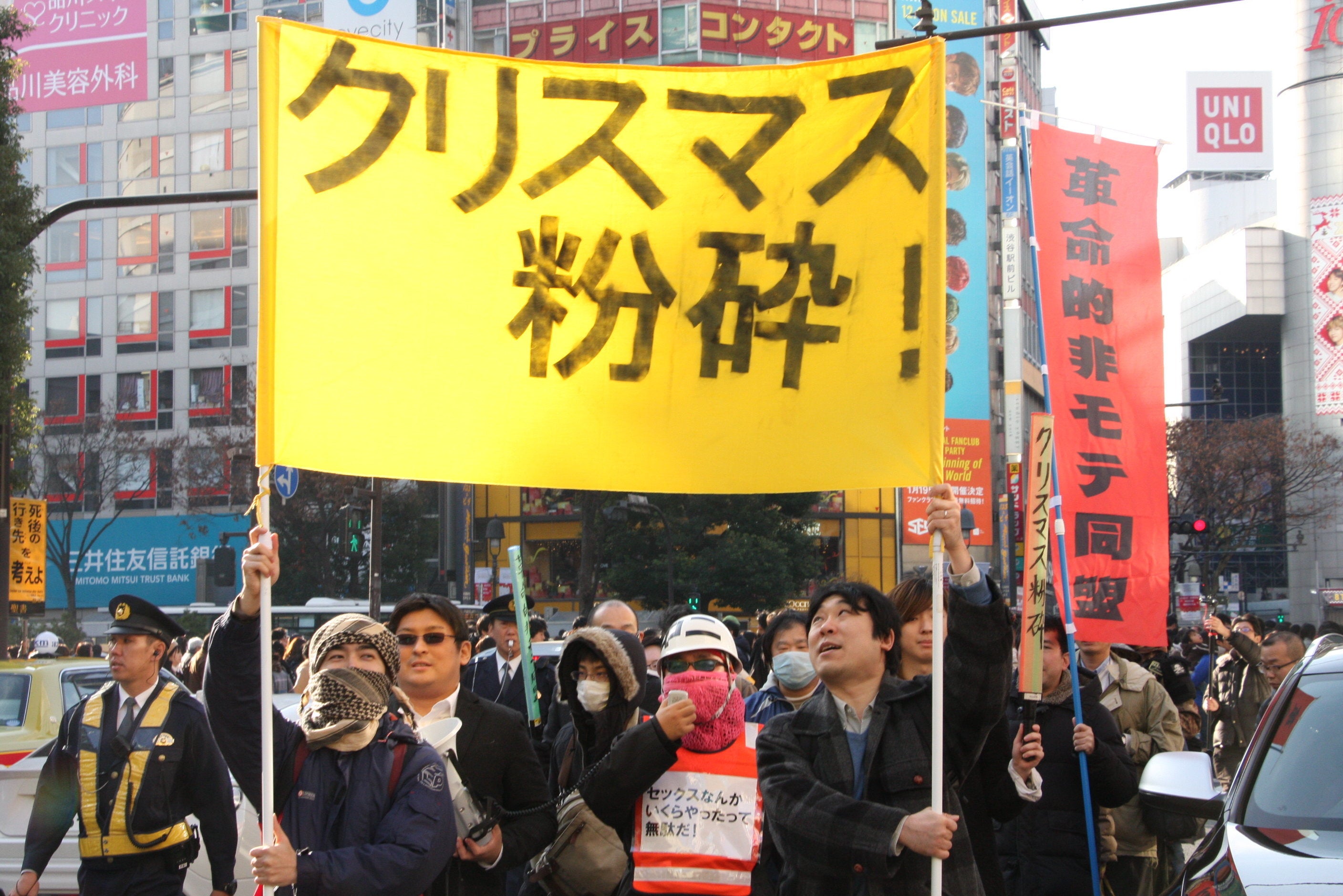 「革命的非モテ同盟」は、毎年渋谷の街でクリスマスを粉砕するためのデモを敢行している。クリスマスの空気に飲み込まれて、世論誘導的な消費活動を行う庶民に対して警告を発し続けているのである。