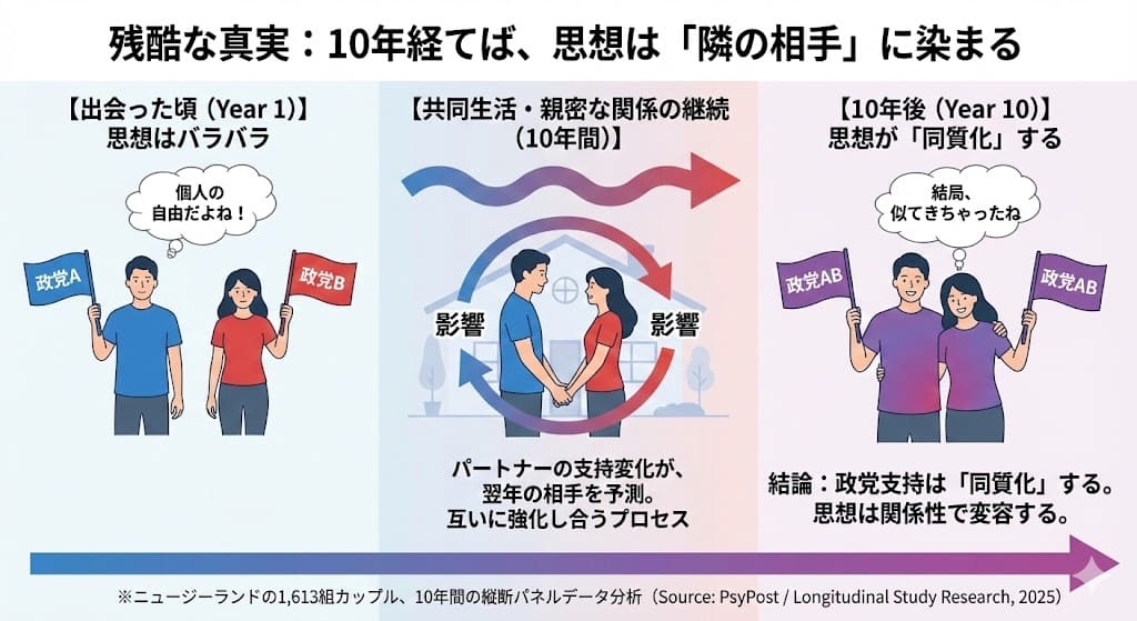 2025年の研究を紹介します。親密なパートナーシップは、個人の政治的思想を相互に塗り替え、同質化させます。