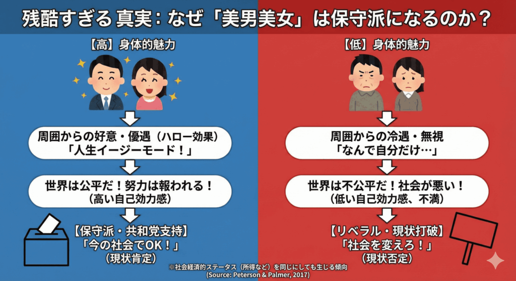 主要な結論として美男美女は他者から好意的に扱われる経験(ハロー効果)を積み重ねるため、世界を「公平で、努力が報われる場所」と認識しやすく、その結果として現状肯定的な保守思想を持ちやすくなることがわかりました。