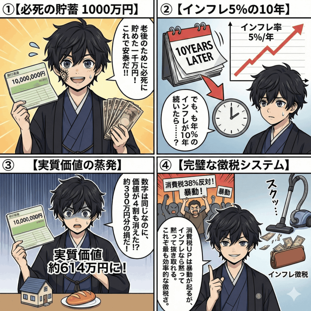 • 貨幣錯覚の利用: 通帳の数字(名目価値)が変わらないため、多くの人は自分が損をしていることに気づきません。