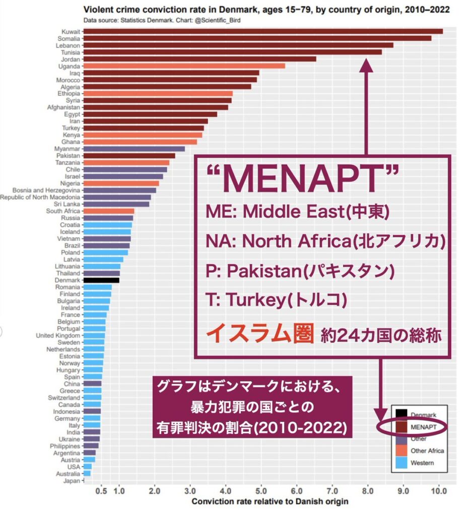 さらに同様の調査では、暴力犯罪を犯した人間の出身地順に度数を並べるとMENAPTが上位を占めてしまうことも判明しました。
