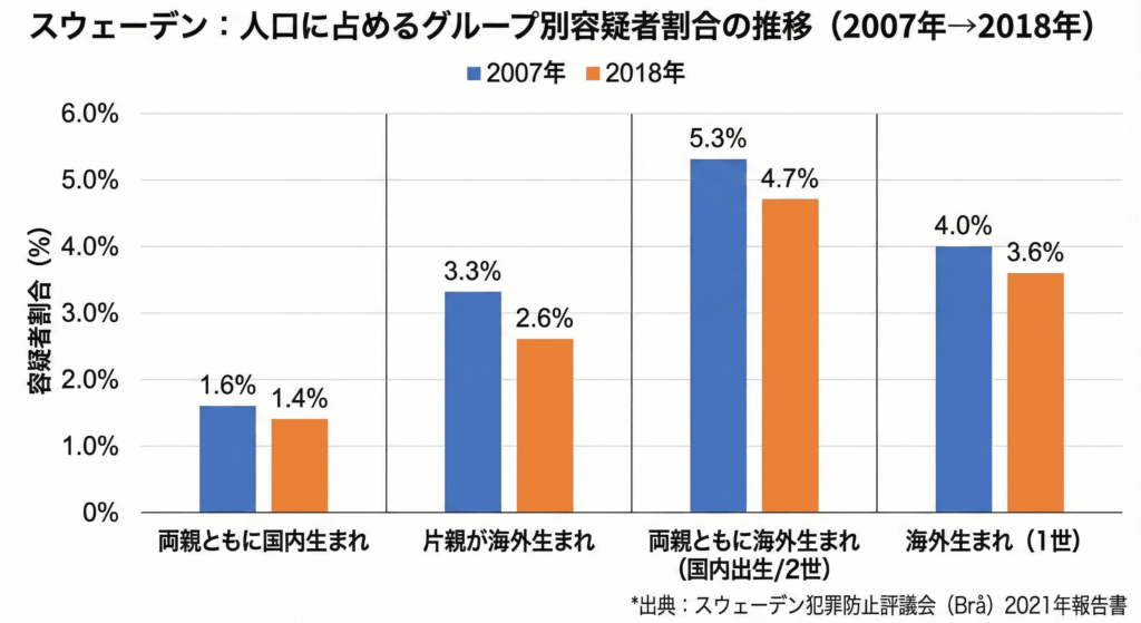 まず大前提として、2007年から2018年にかけて、スウェーデン国内背景を持つ人と海外背景を持つ人の両方において、人口に占める犯罪容疑者の割合は減少しています。