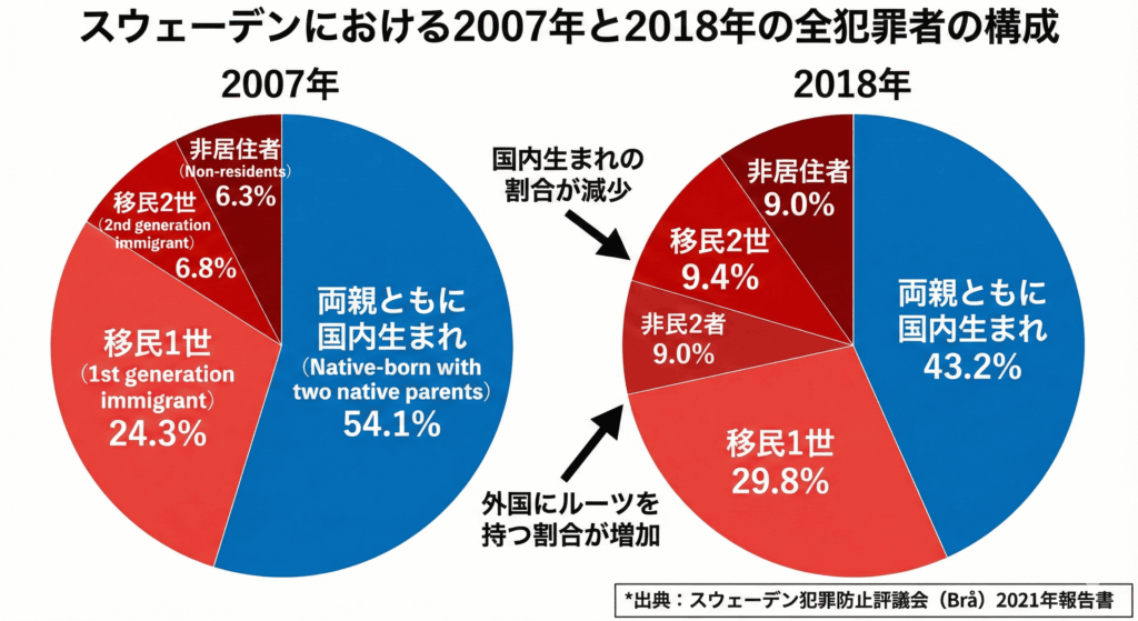 また、人口構成の変化により、スウェーデンの全犯罪におけるグループの割合にも変化が生じています。