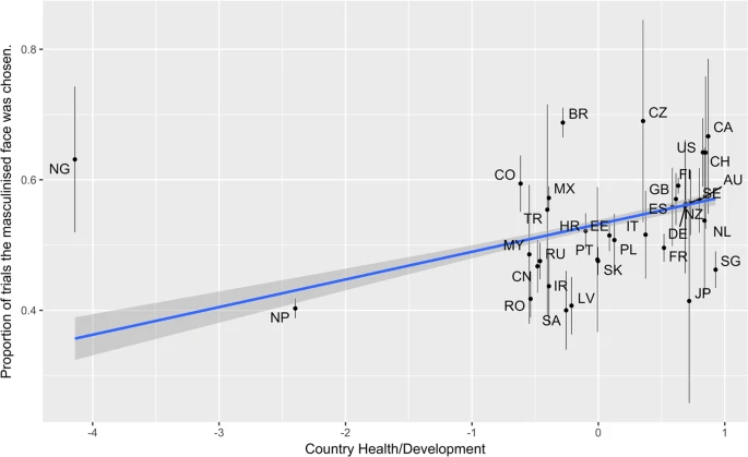 2019年の研究を紹介します。国の健康指数が高く人間開発指数が高い国に住んでいる女性ほど、男らしい顔つきの男性を志向することがわかりました。